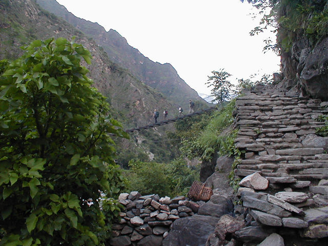 This suspension bridge, just outside Tatopani, crossed the river and swayed about a foot in the wind. This is also where we ran into Kris and Veerle for the first time |