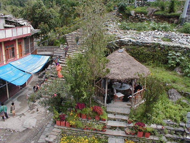 The main "road" is on the left. It runs past the green awnings. The little hut is part of the guesthouse. The "road" is a path, sometimes stone, sometimes dirt, and sometimes mule . . . well, you can guess. |