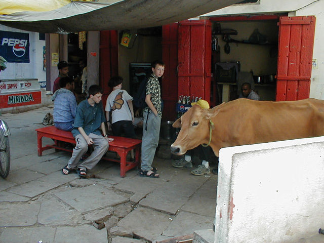 Party crasher. While sitting here for a cold drink, the shopowner told us about Michael, a sadhu from Colorado. He told us admiringly about Michael knowing where to find 12 rupee thali and how he is given tea and never pays. Michael sometimes eats with the shopowners family, had two children in the States who send for him occasionally, is 45, and wears his hair rasta style. |