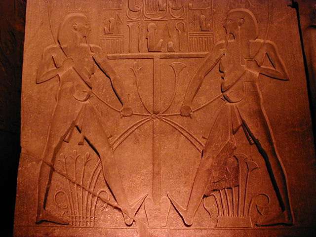 After a week or two in Egypt, the kids quickly deciphered this relief. It depicts Upper and Lower Egypt being bound together - the Lily and the Papyrus |