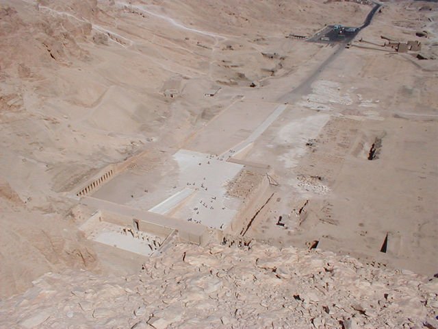 Looking down at Queen Hatshepsut's mortuary temple. Partly rock cut, partly freestanding. |