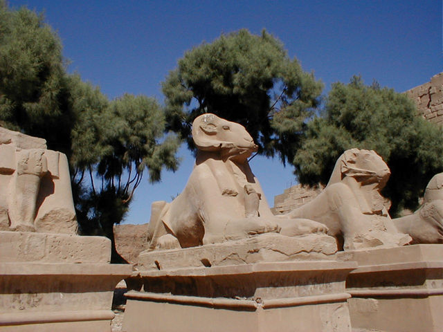 Karnak is more than a single temple. It is a combination of sanctuaries, pylons, and obelisks, all dedicated to the gods - mainly Amun - and the pharaohs. Ram-headed sphinxes line the entrance and an avenue of sphinxes connected Karnak to Luxor Temple. We saw lines of sphinxes amidst houses in between the two temples. |