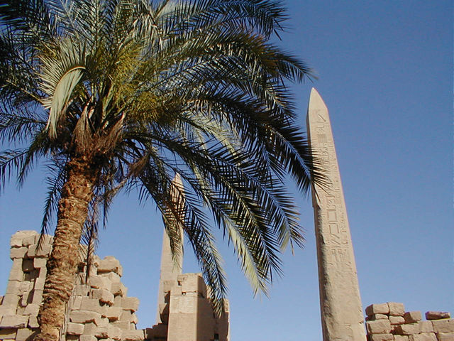 The obelisk on the left is one of the Obelisks fo Hatshepsut. Tuthmosis III attempted to eradicate all signs of the reign of Queen Hatshepsut, his step-mother, and built a 25 meter tall stone structure around this obelisk to hide it. It is the tallest obelisk in Egypt and the top half was orignially covered with electrum, an alloy of gold and silver. |