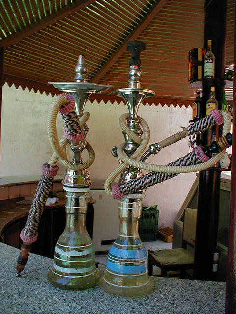 Sheesha, water pipes for tobacco, usually seen in ahwas, coffeeshops, where patrons receive use of a pipe, coals, and tobacco |