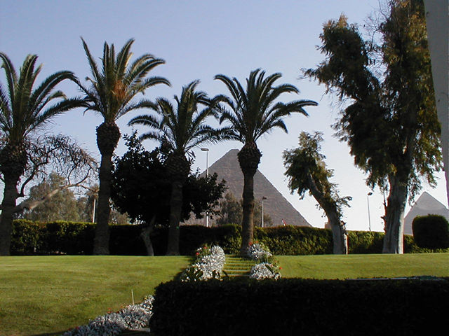 View of the pyramids from the Oberoi Mena House, apparently you can float on your back in the pool and see the pyramids. We just looked in. |