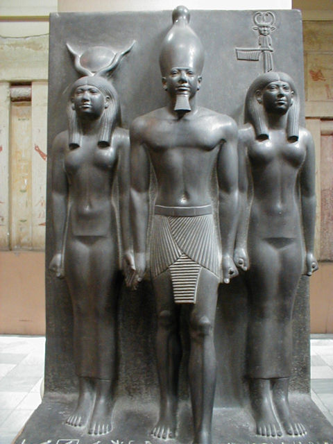 Triad of Menkaura. Found in the valley temple associated with the "little" pyramid at Giza - the pyramid of King Menkaura. The kind wears the crown of Upper Egypt and is flanked by Hathor - god of music, beauty, and love - and a woman who represents one of the districts of Egypt. |