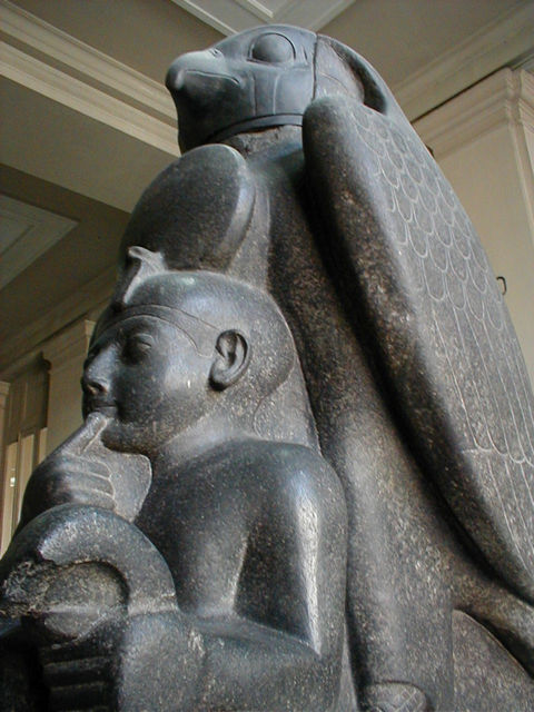 Ramses II and Horun. This shows the royal child Ramses being protected by a huge falcon. The sculpture is a sort of visual pun or hieroglyph of the king's name: ra (the sun disk), mes (child with the finger in his mouth), and su (the plant held by the child). |