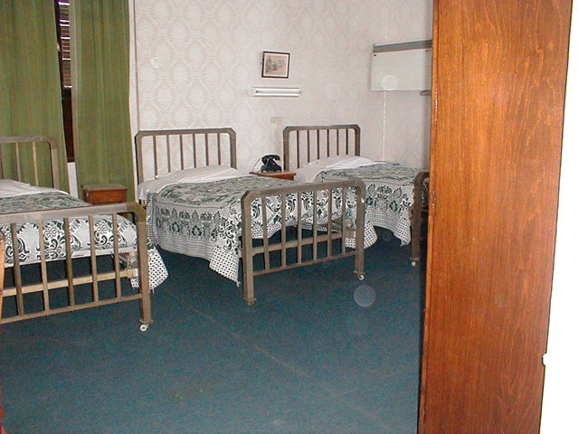 A neighboring room with what appear to be hospital beds. You might be able to see that the middle bed has a distinct headward slant to it." align="right |
