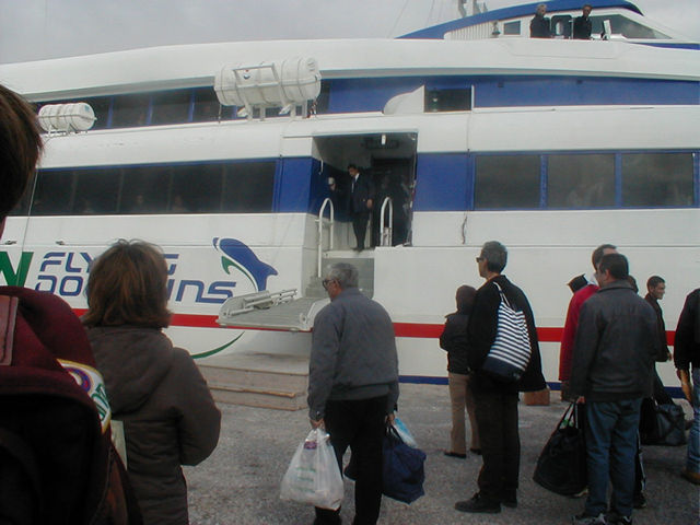 Boarding the Sea Cat, a fancy and fast catamaran ferry, for the ride back to Athens |