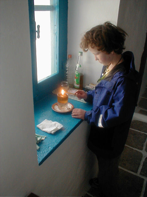 Maggie lighting the oil lamp with a candle. This picture shows the oil lamp paraphenalia one finds in nearly every church, including some paper on which to wipe one's fingers |