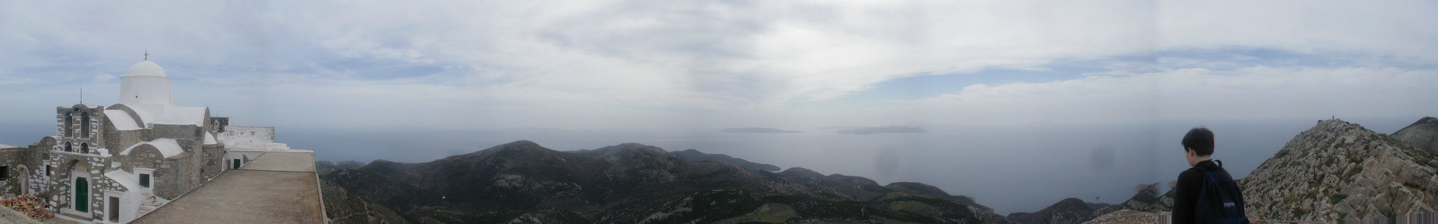 View from Profit Elias. On the left is the church. The thing that looks like a sidewalk is the roof over the monk's cells. Out in front of Tote are the Cyclades - islands of which one is Sifnos |