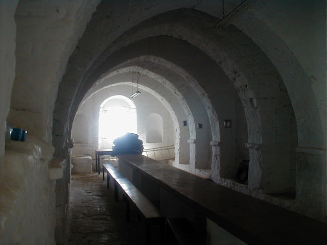 The dining hall. Now, there's a sign saying, "You can make coffee here," and there's coffee, sugar, greek coffee pots, two cups, a spoon, and a little bottled gas stove. Every church has candles, incense, a lamp, matches, and something to wipe your hands on. The coffee arrangement seemed similar. Amazing! (Yes. We made coffee!) |