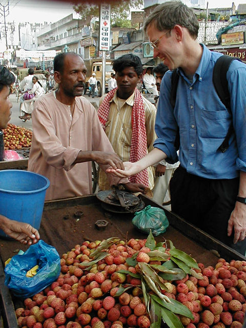 Mark buying litchi (that's lee chee) fruit. He is in the middle of haggling over the price. |