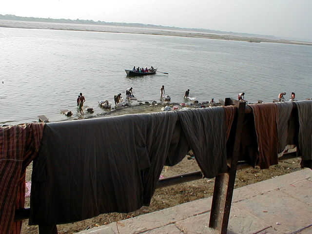To the right of the swimmers along this section of the Ganges, is the laundry. Men rub and sling clothes against flat rocks at the River's edge. Their efforts make slapping and popping sounds. Just to the right of the laundry, there are bodies being covered with wood and cremation bonfires. |