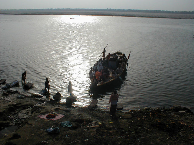 A boat with the body of a sadhu stops near the laundry for pictures. Then it sailed a bit farther out and dumped the body, the stretcher, and the funerary cloths overboard. (Sadhus are not cremated.) |
