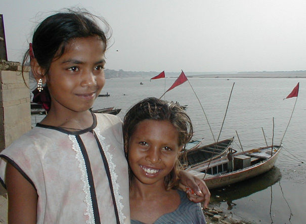 Two smiling kids and boats along the Ganges. The girl in white goes to school. She was very articulate and charming. She sells tiny little votive candles made from a spot of wax and a wick on a tiny dish about the size of a half dollar. |