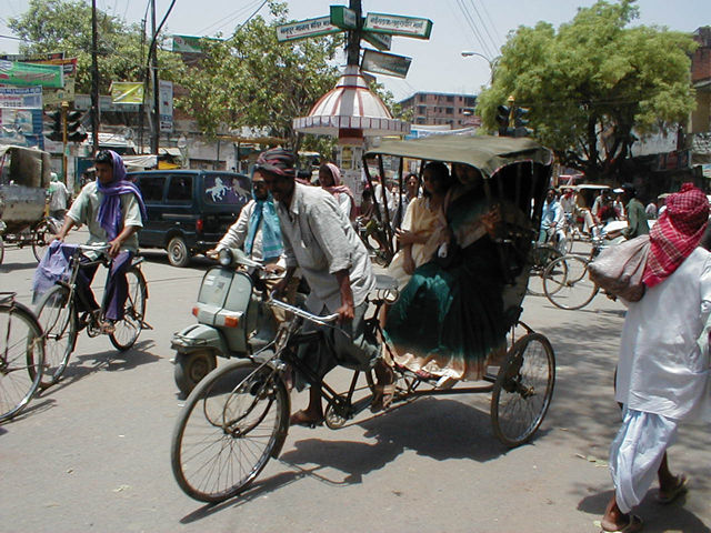 Rickshaw in the bustle of a traffic circle closed to autorickshaws and cars. Curiously the photo does not show the dirt |