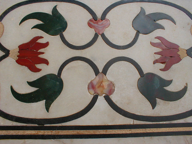 As embodied in the Mughal craft, pietra dura incorporates the inlay of semiprecious stones of various colours, such as lapis lazuli, jade, crystal, turquoise, and amethyst, in highly formalized and intertwining geometric and floral designs. The colours serve to moderate the dazzling expanse of the white marble. |