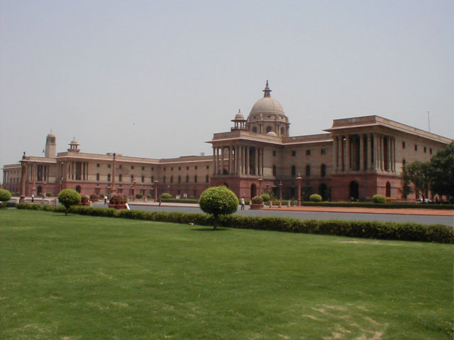 The Secretariat buildings at the end of the Rajpath, opposite India Gate. They sit on Raisina Hill which had its top blasted off to make an acropolis for the President's house and the Secretariat buildings. (Imagine the relation of the Capitol Building in DC to the Washington Monument, and you'll get a fair idea of how impressive the view down the Rajpath is.) |