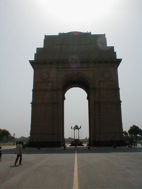 India Gate. In 1911 when the British decided to transfer the capital of India from Calcutta to Delhi, they chose a site three miles south of the existing city of Delhi. Edwin Lutyens was selected to advise on the planning of the new capital. His plan, with a central mall and wide diagonal avenues with trees in double rows on either side, resulted in a center city that is very reminiscent of Washington, D.C. The mall, with reflecting pools, etc. is called the Rajpath and the All India War Memorial Arch, called the India Gate, is near the eastern end of it. (The President's house - once the Viceroy's residence -- is on a small hill at the western end.) |