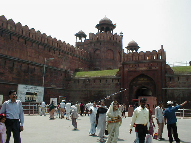 The entrance to the Red Fort. Indians pay 4 cents; foreigners pay $5. The Fort, though it served as a military barracks for the British and still does so for the Indian Army, originally enclosed living quarters and gardens for the emperor and the royal court. |