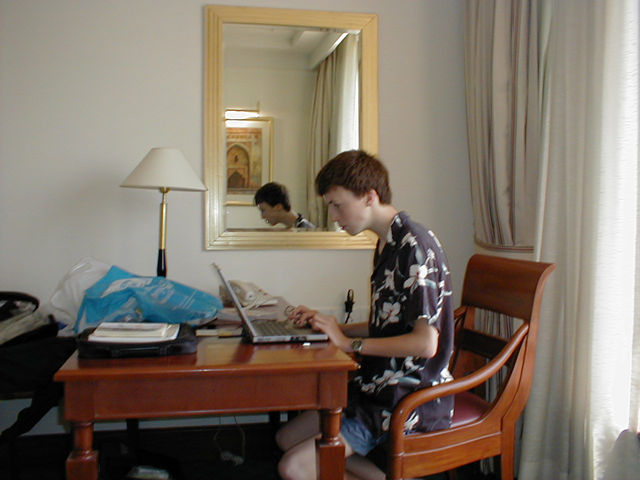 Duncan working in our fancy hotel room.