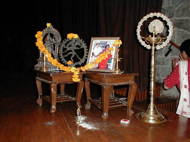 Shrine on the stage. Traditionally, Kuchipudi begins with the sprinkling of holy water and the burning of incense. |