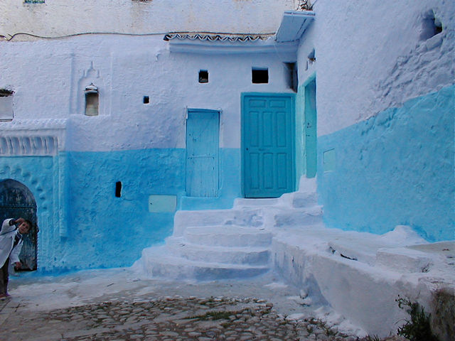A newly painted but typical house in Chefcaouen's medina - the old, walled part of town. |