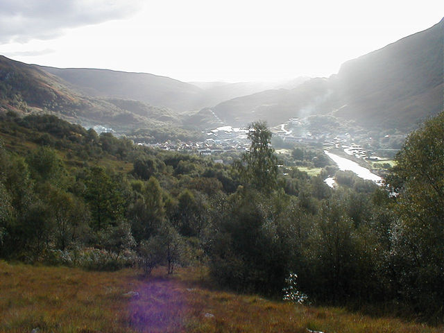 Kinlochleven as we ascend an old military road on the last day. The "line" coming down the mountain on the far side are giant pipes carrying water from a reservoir to generators at the plant. Loch Leven (which we somehow did not get a picture of) is to the right |