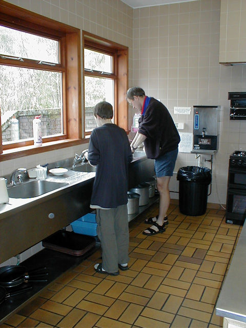 Mark and Tote do the dishes in the spotless Crianlarich hostel |