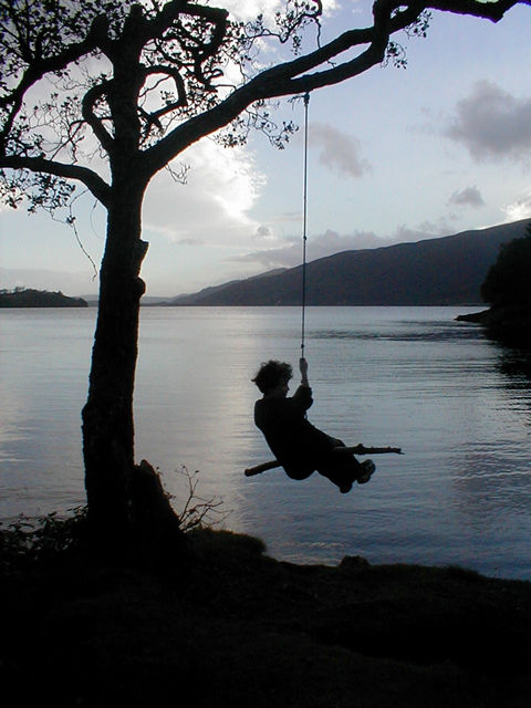 One of many stunning views along the West Highland Way: Maggie swinging on the bank of Loch Lomond |